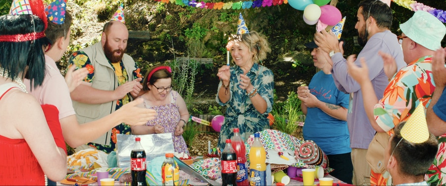 逃げこんだバスの中で不安な顔つきをする主人公・パウロをよそに、サマーキャンプにわくわくな入所者たち。仲間のお誕生日会や青空の下のヨガ、それらを楽しむ彼らのチャーミングな笑顔など、ゆかいであたたかなサマーキャンプの日々を想起させるシーンが色鮮やかに収められています。